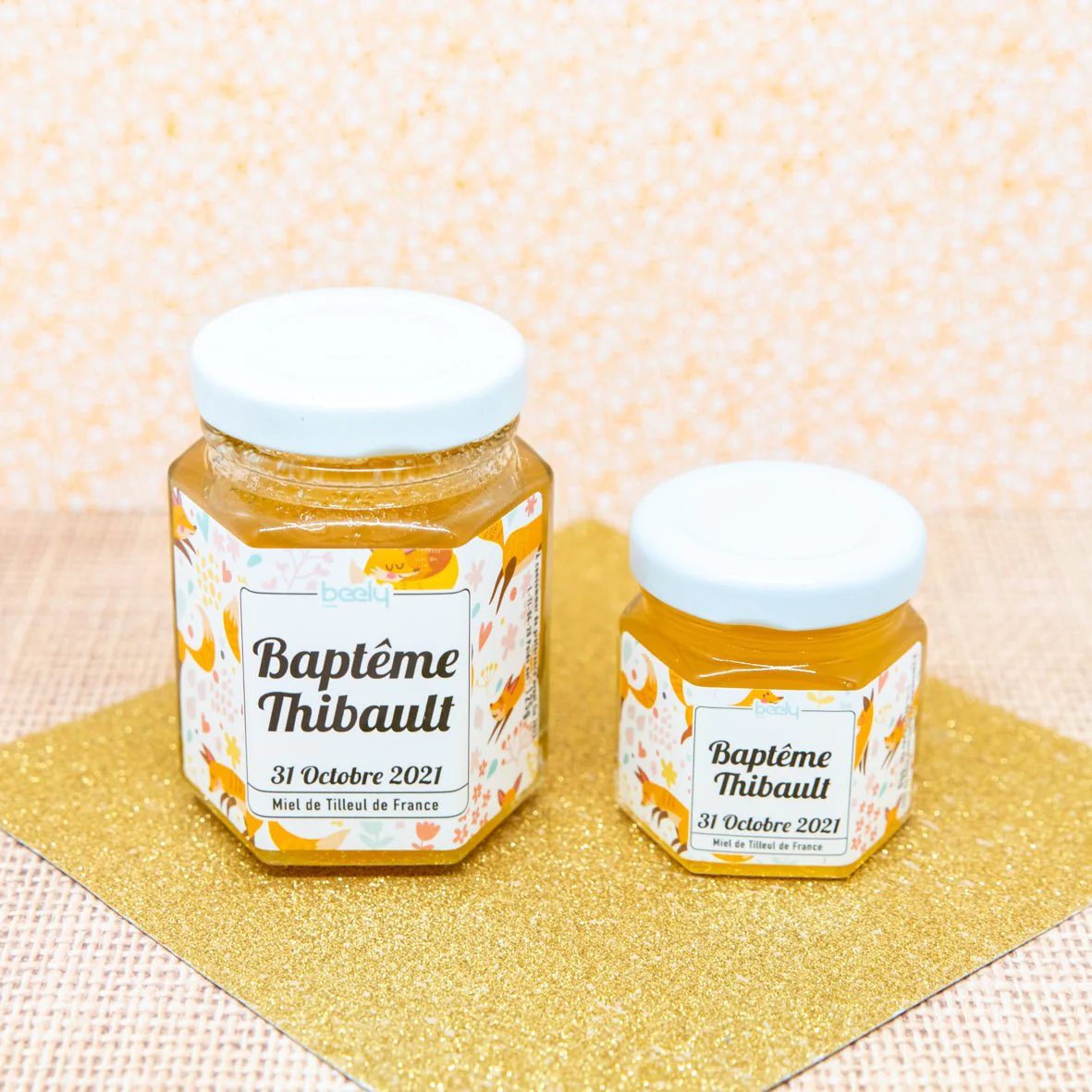 Regarde nos délicieux pots de miel, qui peuvent être personnalisés avec ton propre motif de fond !